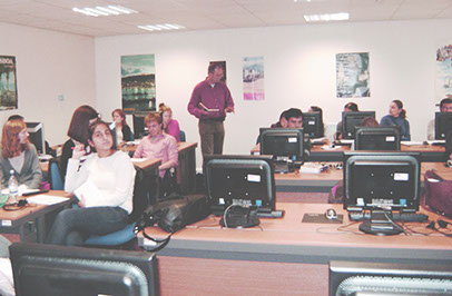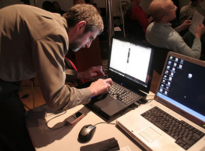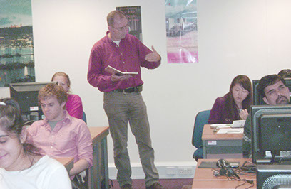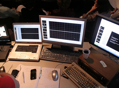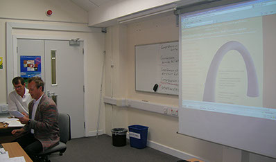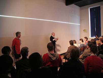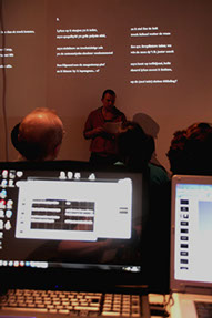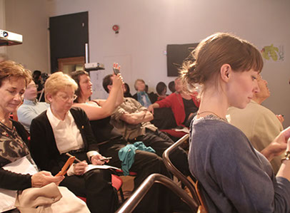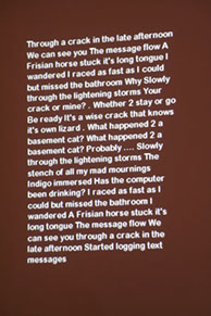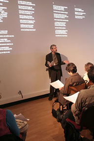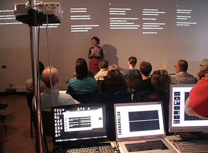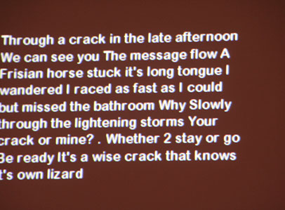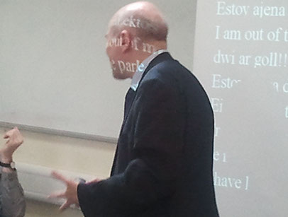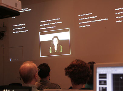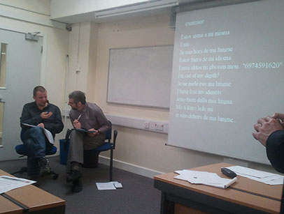 Students and staff have used mobile phones to instantly publish their textual throughts, using the artists TXT2 software. A line, "I am out of my languages", taken from Philips poem Spoor, formed a short provocation which was texted and projected onto a screen for all to read. The room burst into activity, and within around four minutes a series of translated versions emerged, line by line below the first. Witnessing this was a fascinating experience, for the first time those present witnessed something of the nature/nurture conflict within the term translation. These short pieces of projected text turned out not to be copies at all, but completely new, and therefore displaced, originals! See the banner on the right