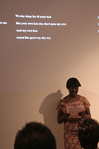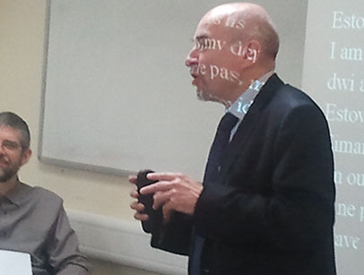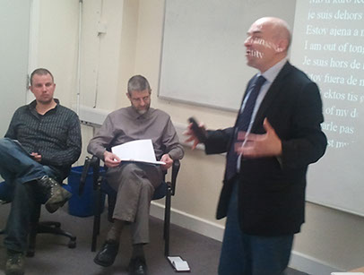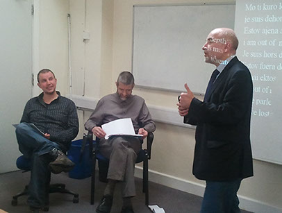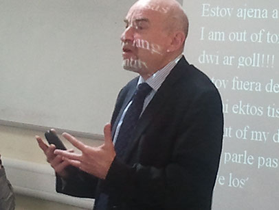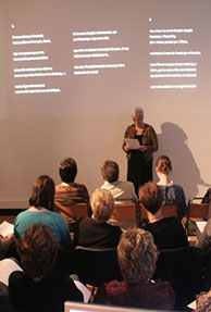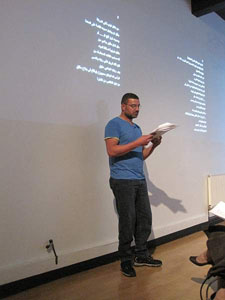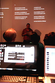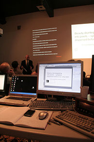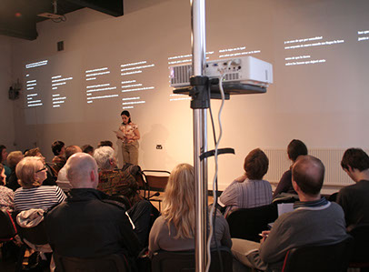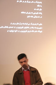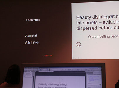 Poems, poets, translators, media projection and live txting will provide an array of engagement. The poets will read, the translators present their new translated originals. The Poets will use the txting system to write a Heiku (a short poem) which the translators will translate, before the floor was opened up to everyone to join in.